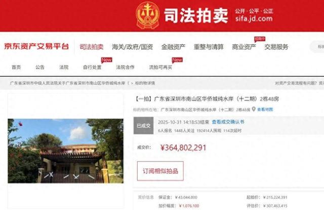 10月31日,深圳南山区华侨城纯水岸别墅在京东资产交易平台以超3.64亿元成交,单价达57万元/㎡,不仅成为深圳史上最贵法拍房,更以单套总价刷新全国司法网络拍卖住宅纪录。