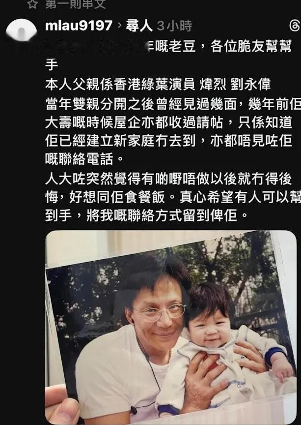 近日网友Mic发文上载一张儿时父子合照,相中炜烈抱着仍是婴孩的Mic,写道︰“希望找回失散多年的老豆,各位脆友帮帮手,本人父亲是香港绿叶演员炜烈,刘永伟。当年双亲分开之后,曾经见过几面”