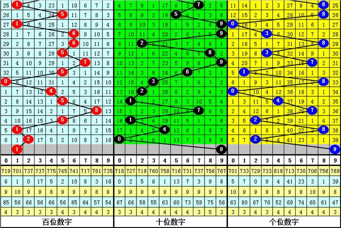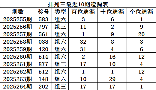 十位:上期为0,近10期012路比为4:4:2,其中0路号遗漏5期出现,本期注意0路号再出,参考9。